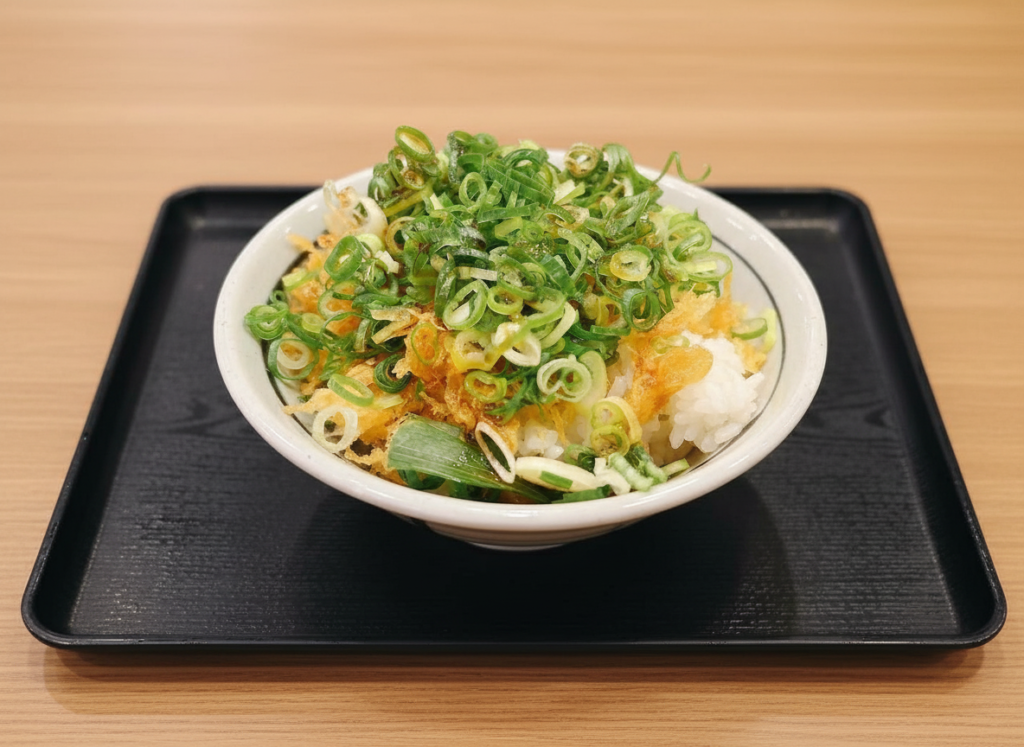 天丼用ごはんに無料の青ねぎと天かすを盛るだけで完成する「青ネギ天かす丼」は、約180円で楽しめる神コスパどんぶりです。