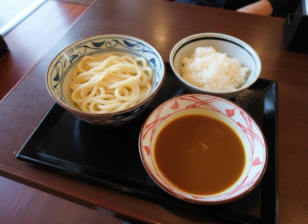 カレーうどんをセパレート注文して、うどんとカレー丼を一度に味わえる贅沢アレンジ。前半はとろみのあるカレーだしでうどんを楽しみ、後半は残ったカレーにごはんを合わせて“追いカレー”感覚でガッツリ一杯。