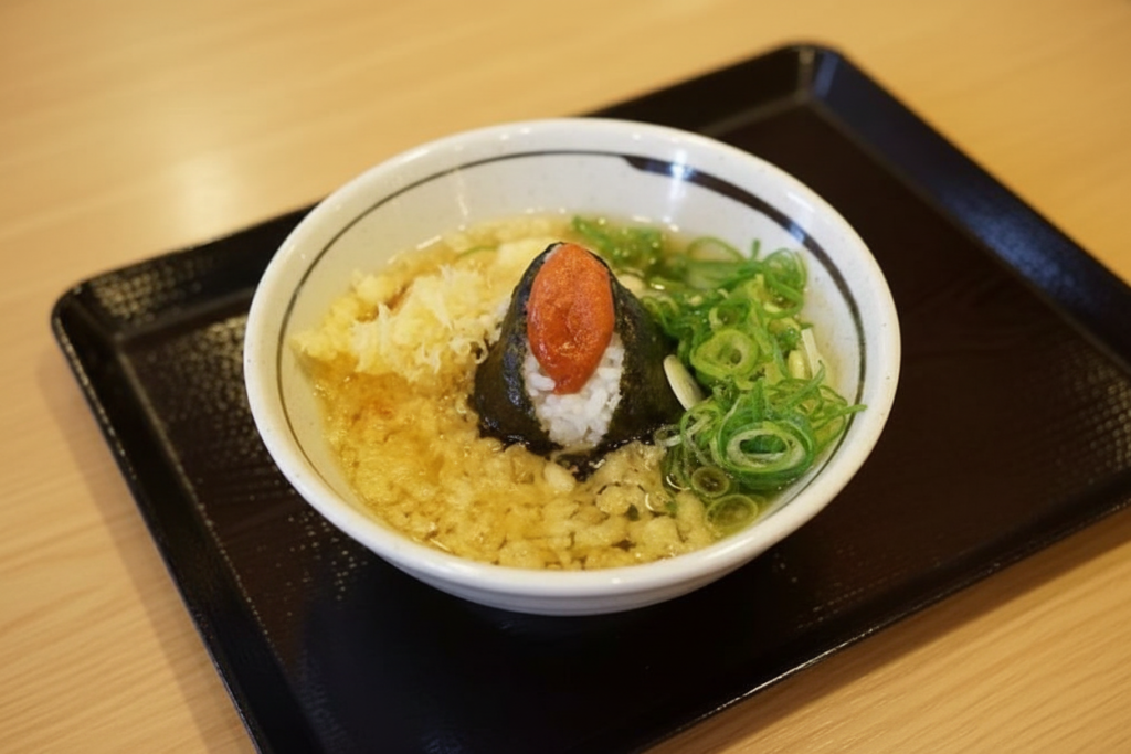 明太子おにぎりに熱いだしをかけると、明太子の塩気と旨みがふんわり広がり、シンプルながら贅沢なだし茶漬けに変身。さらっと食べられ、うどんの〆にぴったりな一杯です。