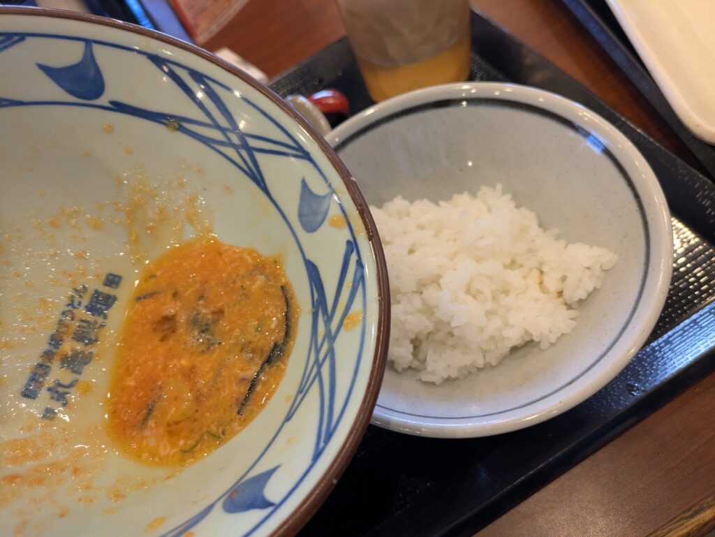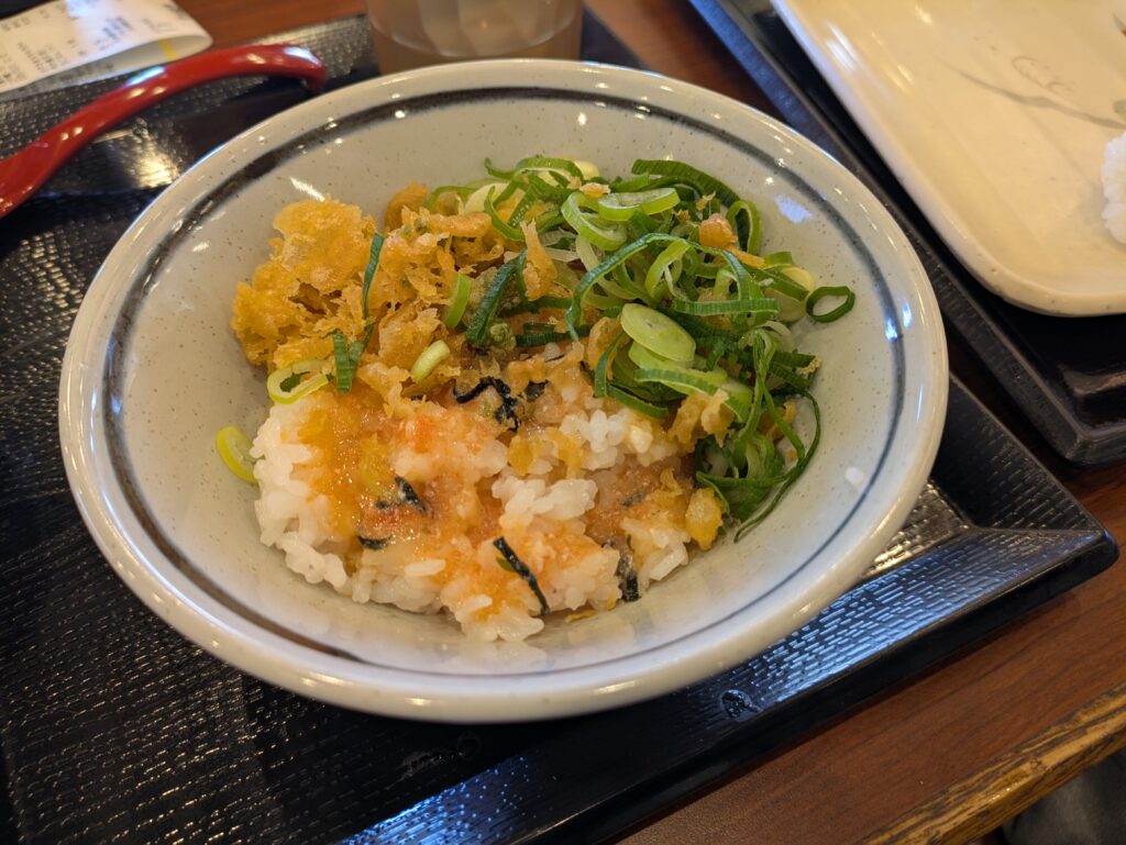 まずは明太釜玉うどん(並)をそのまま味わい、食べ終わった丼にごはん小を投入して第2ラウンドへ。丼に残った明太子と卵がごはん一粒一粒に絡み、そこへ天かすと青ねぎを加えることで、濃厚さとサクッとした食感、香りが一気にアップします。